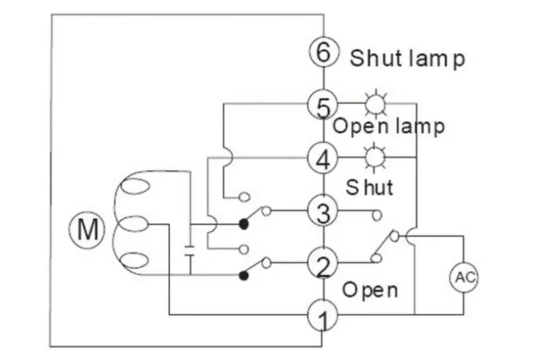 開關(guān)型帶無源觸點(diǎn)型反饋電動(dòng)蝶閥接線圖,1,2,3是控制部分接線,4,5,6為無源觸點(diǎn)反饋。